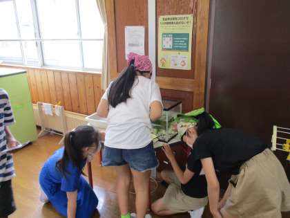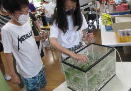 教室のワークスペースに、松組と竹組のめだかの水槽が準備されました。理科の学習でめだかの観察をしていきます。