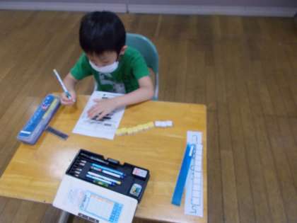 ブロックを使って、いくつといくつに分かれるか、考えています。ブロックを使って、指を使っての繰り返しから、徐々に組み合わせを覚えていけるようにがんばっています。
