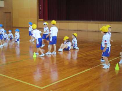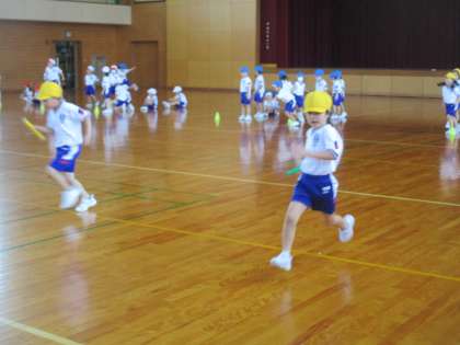 いろいろな歩き方で体を動かした後は、お待ちかねのリレーです。