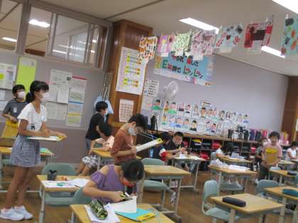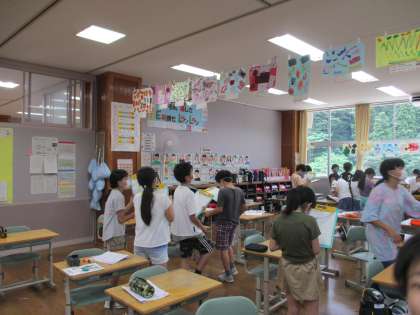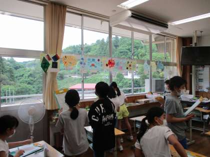友達の作品を鑑賞しました。絵の具の色や模様を工夫している人や題名が面白い人がいて、みんなの心の模様の多様性を互いに楽しみました。