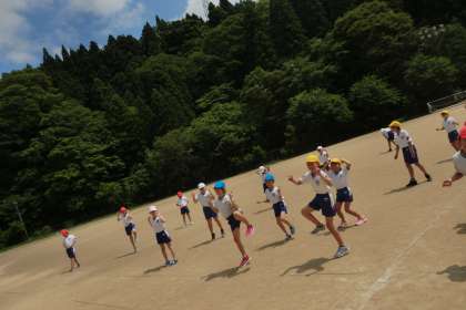 準備運動の後は、走り幅跳びです。どうしたら遠くへ跳べるのか、助走・踏み切り・着地に気を付けながら頑張っていました。