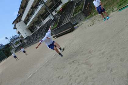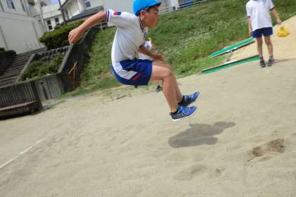 準備運動の後は、走り幅跳びです。どうしたら遠くへ跳べるのか、助走・踏み切り・着地に気を付けながら頑張っていました。