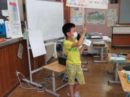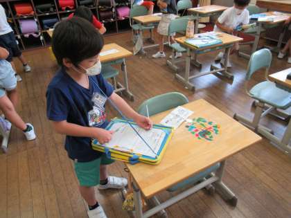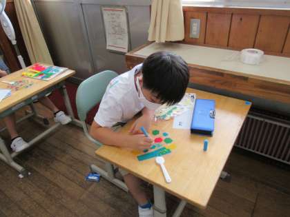 図画工作科の学習で、セロハンを使ったうちわ作りをしました。