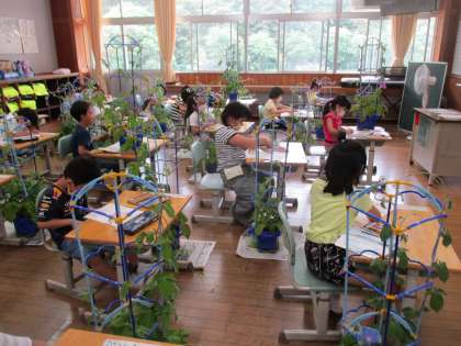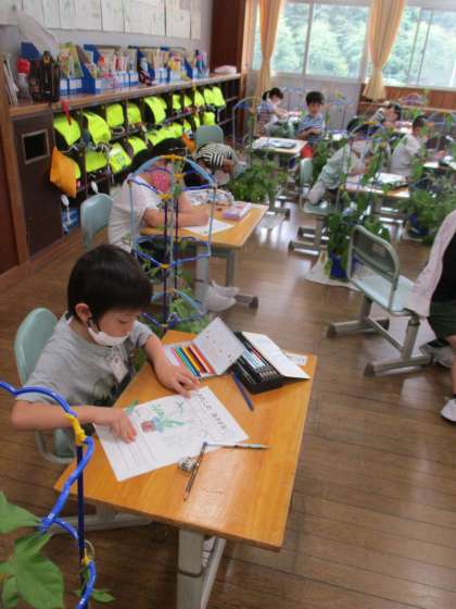 つるを伸ばしてみると、自分の背を超していたことにびっくりしていました。すでに花が咲き始めた子もおり、あさがおの生長を喜んでいます。