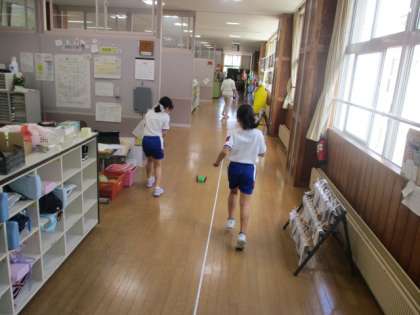 ゴムの伸びを変えて、どれだけ車が動くかを調べています。3回走らせて、それぞれの結果を記録します。そして、一番遠くまで行ったときの距離を、代表する数として記録します。子供たちは、正確に測るために3回測るのだと話していました。