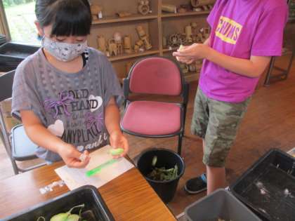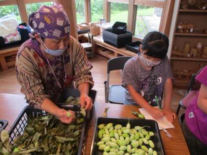 連休中に「けば取り」の体験があり、希望者が参加して挑戦しました。天蚕のことについて、いろいろと質問もしていました。
