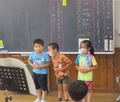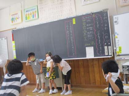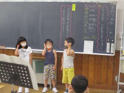 国語科の「おむすびころりん」の学習の集大成として、グループでの音読発表会を行いました。登場人物の気持ちや場面の状況が聞いている人に伝わるように、各グループで音読の仕方を工夫することができました。