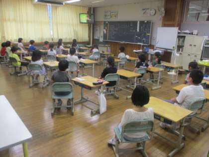 テレビ放送されている校長先生のお話を聞きました。みんな真剣に聞いています。
