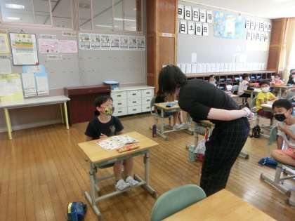 新しい先生の自己紹介を楽しく聞いたり、クイズに答えたりして楽しく学びました。