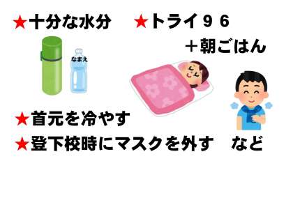 十分な水分の持参、トライ96、首元を冷やす対策、登下校時の注意等、みんなで気を付けていきましょう。