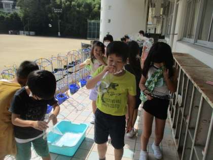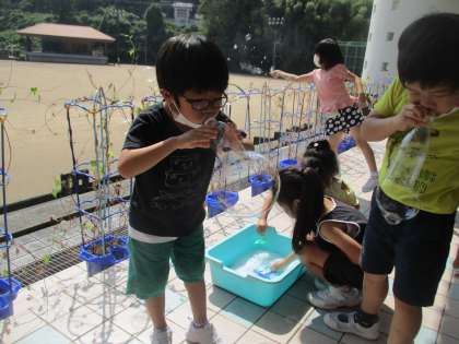 今日は2回目のシャボン玉遊びでした。前回の活動を振り返り、どんな材料を使えばうまくいくかや失敗した経験を話し合って、解決策を考えてから活動に取り組みました。
