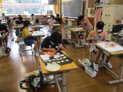 「防火ポスター」を作成しています。文字の色塗りや絵の具の色の濃さに気を付けながら集中して取り組んでいます。
