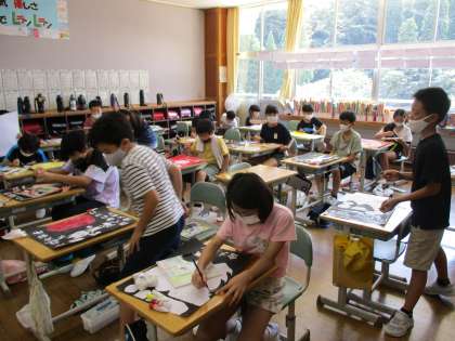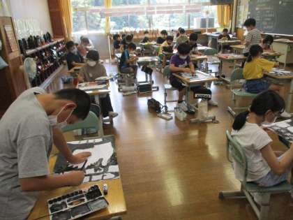 「防火ポスター」を作成しています。文字の色塗りや絵の具の色の濃さに気を付けながら集中して取り組んでいます。