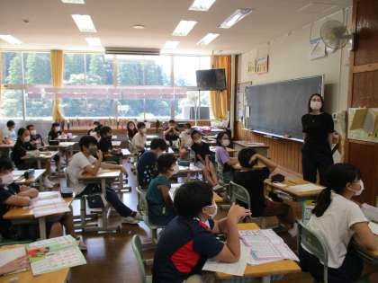 2学期から、新しいALTの先生に代わりました。オーストラリア出身の先生で、オーストラリアの文化や日本の文化との違いを教えてもらいました。拍手の仕方が、オーストラリアでは、円を描くように回して拍手をすると聞き、早速試してみる5年生です。今日は、自分たちの「名前」や「好きなもの」「誕生日」など、自己紹介をしました。
