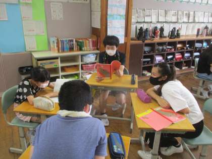 習った漢字を正しく使って、物語をつくりました。友達の話を楽しそうに聞く子供たちの様子です。普段から習った漢字を使って、自分の生活に生かしていきたいですね。
