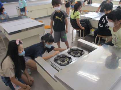 家庭科室では、安全に気を付けてガスコンロに火を付ける練習を交代で行いました。「火がついた!」「ガスのにおい、臭い!」と話しながら、ガスコンロを使った活動に真剣に取り組んでいました。