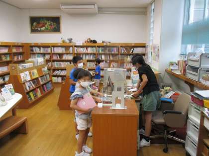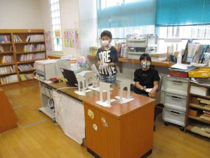 新型コロナ対策のため、図書室の貸し出しカウンターにアクリル板パネルを設置し、委員会の子供たちの手で貸し出しができるようにしました。