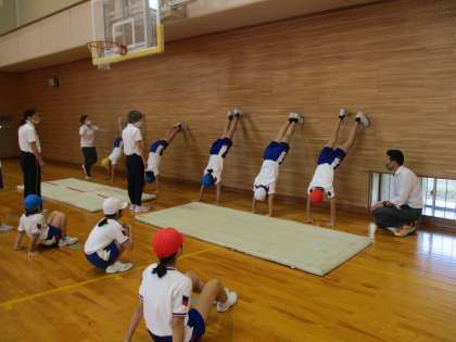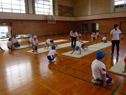 運動する中で、苦手な動きや側転の時の利き足が分かり、あらためて基本の大切さを感じました。前転では、足を伸ばした高さから前転をすると勢いがついて回りやすいことも教わりました。
