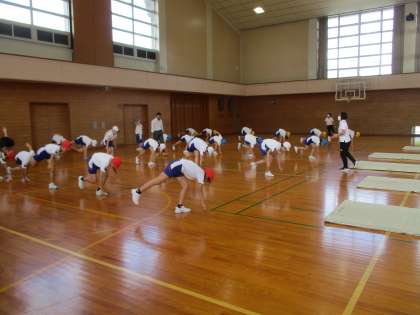 運動する中で、苦手な動きや側転の時の利き足が分かり、あらためて基本の大切さを感じました。前転では、足を伸ばした高さから前転をすると勢いがついて回りやすいことも教わりました。