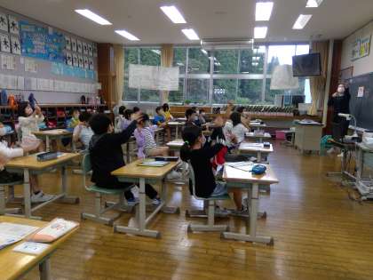 「好きな○○は何ですか?」の言い方を復習しました。チャンツを歌ったり、自分たちの好きな色や食べ物でチャンツを改良して歌ったりして、楽しみました。