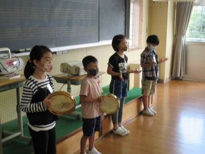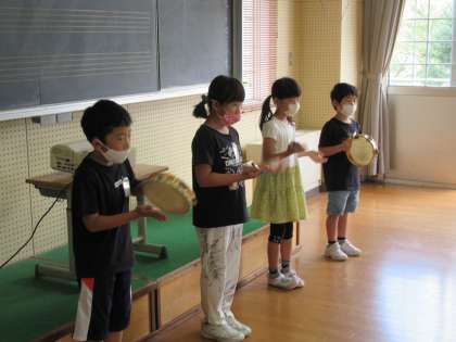 音楽科の学習で、タンブリンパートとカスタネットパートに別れてリズムをうちました。