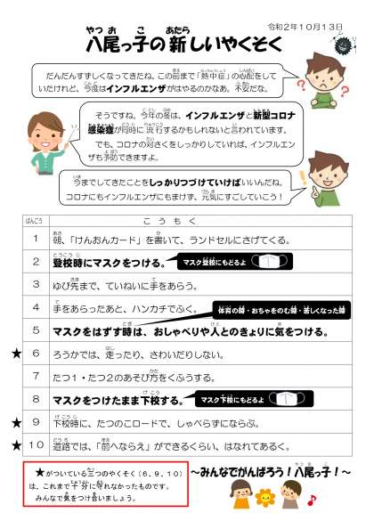 明日の朝から、マスクを着用して家を出発するよう、おうちの方の声掛けをぜひお願いします。