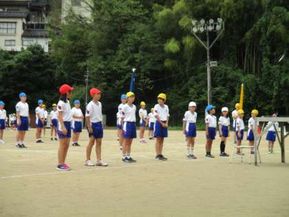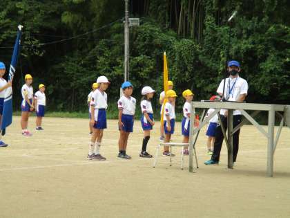 閉会式で、○○m走の学年1位の子供たちが表彰されている場面です。
