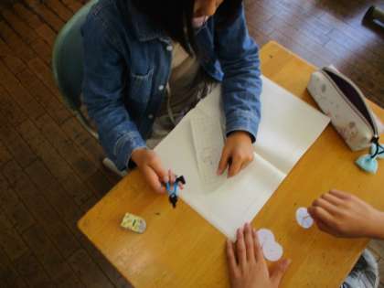 算数の時間に、コンパスを使って模様を描きました。その模様を画用紙に貼って中心に楊枝をさすと、色の変わる「色変わりごま」の完成です。