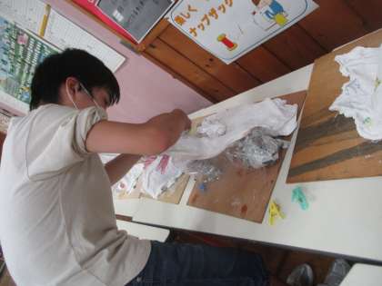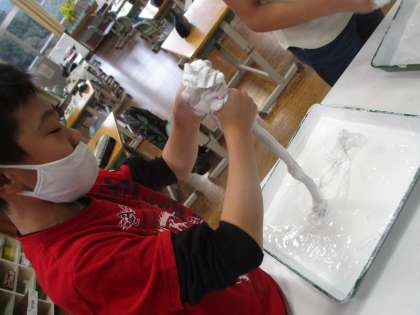 布を固めた形から想像を広げて、立体に表します。液体粘土の感触を楽しんだり、身の回りにあるものを使って固め方を工夫したりしました。