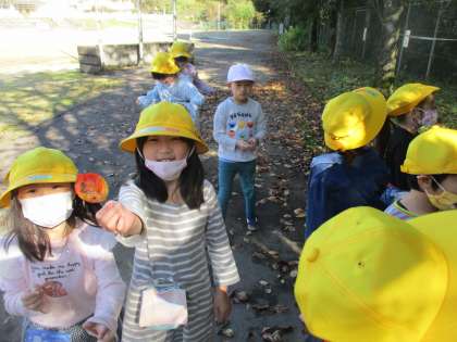 学校のグラウンド周辺を散歩して、秋を見付けてきました。トンボ、赤や黄色に色づいた葉っぱ、すすき、くりなど、たくさんの秋を見付けることができました。