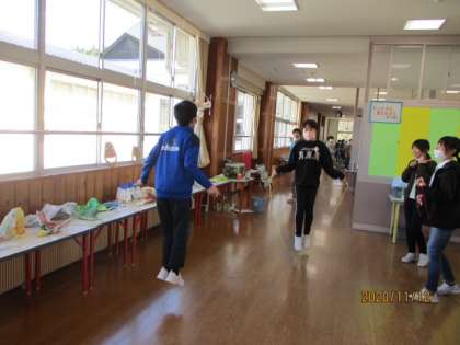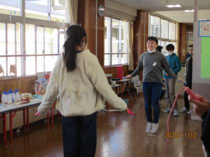 朝トレーニングで短縄跳びをするようになってから、休み時間になわとびをするようになりました。2つのグループに分かれ、リレー形式で二重跳びをつないでいき、自分たちなりにルールを決めて遊んでいます。運動不足も解消され、男女問わず一緒に競っていて、とても楽しそうでした。