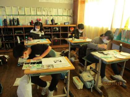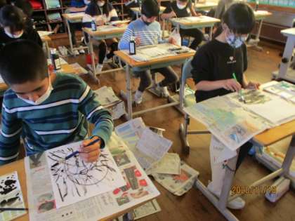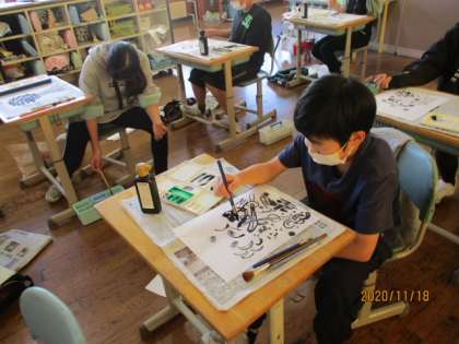 今日は、筆づかいや墨の濃淡を生かしながら墨絵に挑戦しました。墨を水で薄めながら描くのは、なかなか難しかったようですが、試行錯誤しながら楽しんでいました。思うように描けて満足したり、偶然に面白さが生まれたりして取組もさまざまです。どんな出来上がりになったのか、楽しみです。