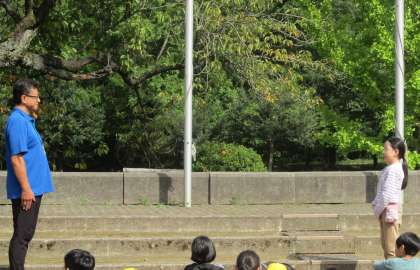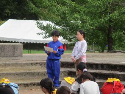 児童代表は、この二日間で学んだ、仲間と協力することの大切さについて話しました。竹ジャングルでは離れた部分に飛び移るときや、ナイトハイクでは真っ暗な中を進むときに、友達の励ましで安心して取り組むことができたそうです。