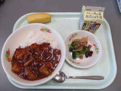 「たべキリンハヤシ」の意味はもうおぼえましたか?「た」は、玉ねぎ、「べ」はベーコン、「き」は、きのこ(しめじ)、「りん」はりんご(すりおろしりんご)です。どの学年もおいしく食べていました。