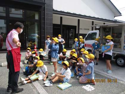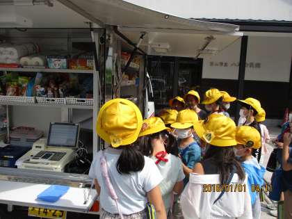 Aコープウインズ食鮮館の見学の後、コミュニティーバスを降りると、八尾公民館の前にアルビスの移動販売車が止まっていました。