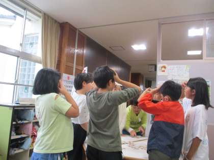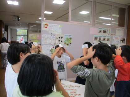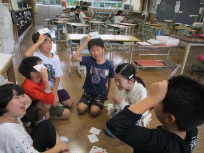 5年生の一番初めに国語科で行った、「ひみつの言葉を引き出そう」の学習。その学習を取り入れた「NGワードゲーム」をつくりました。休み時間には、友達と仲良く遊んでいます。