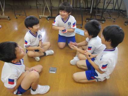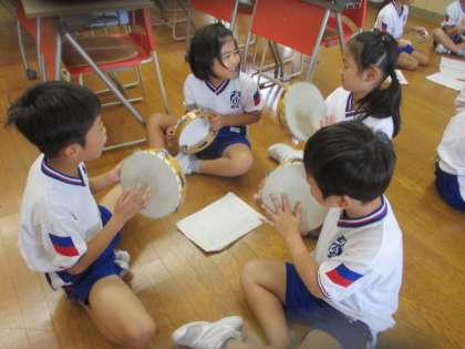 音楽科の学習では、「山のポルカ」の合奏練習をしています。今日は、自分が選んだ楽器でグループごとにリズムを確かめ合いました。鍵盤ハーモニカ、タンブリン、カスタネット、すず、トライアングル、ウッドブロックのそれぞれの音が重なると、「初めての合奏だったけれど、楽しかった」と手応えを感じていました。