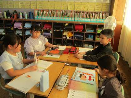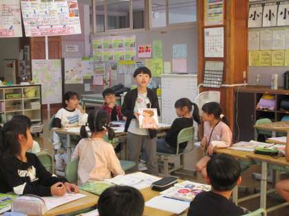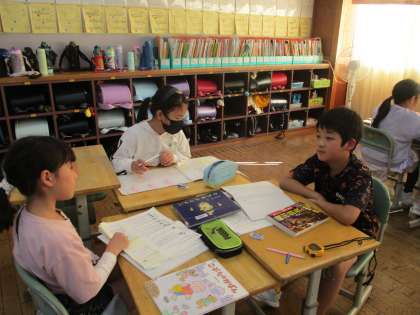 今日の国語は、「1年生さんに本を好きになってもらうために、本を紹介しよう」という目的で話合いの学習をしました。どんな本を紹介したらよいか、それぞれが考えた本の良さを、一生懸命説明していました。また、班ごとに司会役、記録係、時間係と役割を決めて、話合いを進めていました。