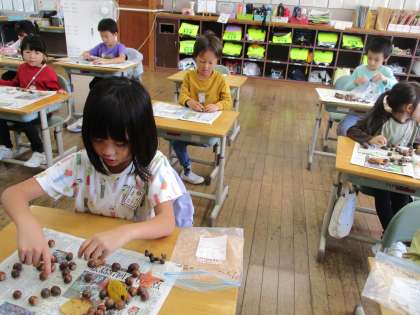 教室に戻ってどんぐりをよく観察してみると、色や形が違っていることに気付きました。「どんぐりでこまがつくれそうだね」「的当てをつくってみたいな」と秋のたからもので遊ぶことを楽しみにしている様子でした。