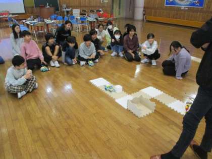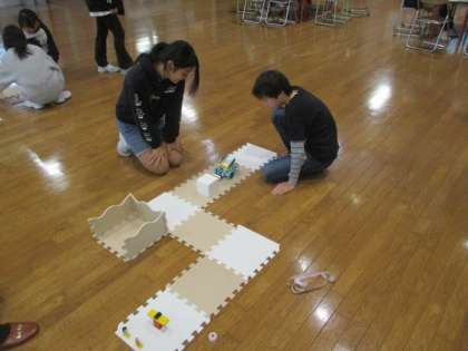 今日のミッションは、アームを使って雪に見立てたブロックをどかし、ルートを通って荷物を取りに行くというものでした。どんな角度で旋回すれば雪をどかし、元のルートに戻れるか、ロボットを走らせながら適切なプログラムを導きます。