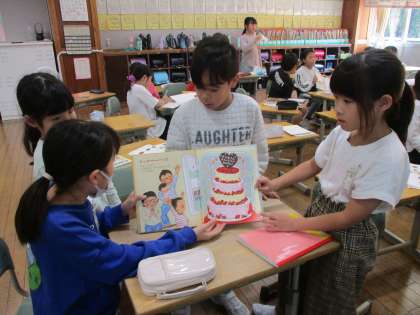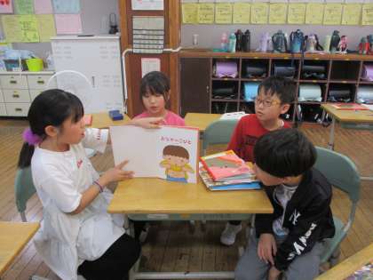 国語の学習で、1年生さんに本を紹介しようという学習があります。明日、1年生さんに本の紹介をする予定です。そのために今日は各班で練習しました。どんな読み方をしたら、1年生さんが興味をもってくれるのか、工夫しながら読む練習をしました。