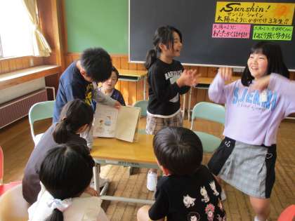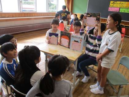 2班は、句点「、」の場所が違うだけで、意味が大きく変わるおもしろい絵本を紹介していました。