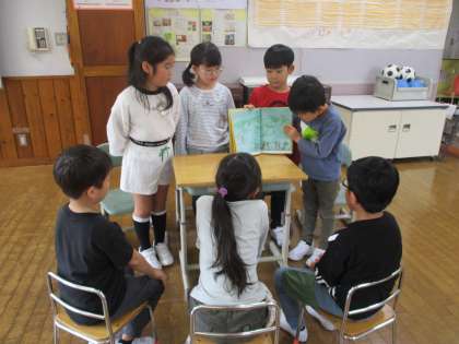 1班は、他の班が動作を入れて読み聞かせしていた良さを取り入れで、即興で身振り手振りを取り入れて、読み聞かせをしていました。