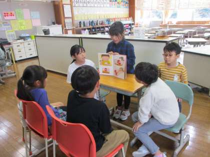 6班は、食べ物が消化する様子を表した絵本を紹介しました。体によいことや悪いこと4ポイント等をみんなで声をそろえて読んでいました。