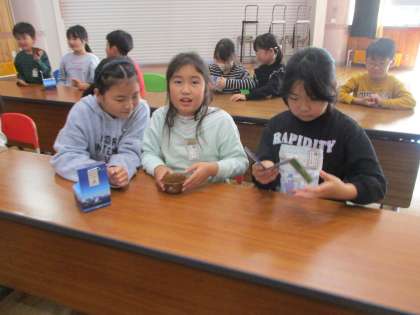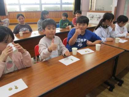 総合的学習の時間では、桑の葉の文化を受け継いでいこうとされているフォーレスト八尾会の方に来ていただいて、お話を伺いました。蚕しか食べないと思っていた桑の葉を活用してつくっておられる、桑の葉茶や桑の葉のクッキーを頂きました。「こんなおいしい物なんだね」と桑の葉を堪能しました。また、五十鈴ビジネスサポートさんからは、桑の葉を摘んだ後の枝を生かして湯飲みのお茶碗を作ったものも見せていただきました。