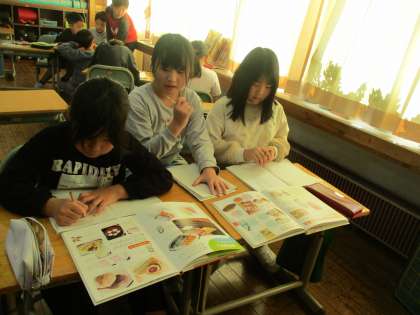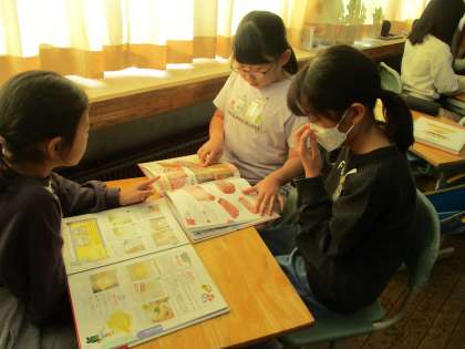 国語では、「姿を変える大豆」の文章を活用して、自分たちでも「姿を変える○○」という文章を書こうとしています。今日は、牛乳や魚、小麦がどんな物に変わるかを本で調べました。