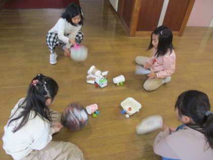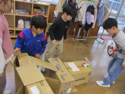 生活科の学習では、ぱたぱたカーを作っています。今日は、自分で作ったぱたぱたカーで、競争したり、風を送って車で押し合いをしたり、コースやジャンプ台を作って遊んだりと、それぞれに遊び方を考える子供たちの姿が見られました。