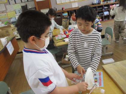 何度も改良を重ねるごとに、「前より速く進んだよ」と完成度が高まってきました。さらに、困っている友達がいると、進んでお助け隊となってタイヤの付け方や風の送り方等を教え合っていました。