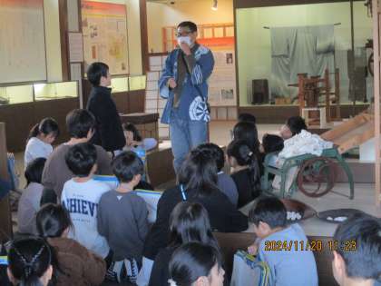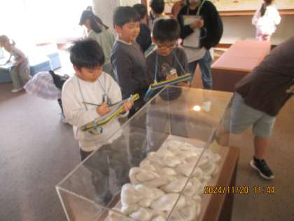 曳山会館では、曳山以外にもカイコについても学習しました。1学期にカイコを育てた経験を元に、曳山会館の方に質問したり展示してあるものを見ながらメモをとったりして、八尾町とカイコの繋がりについて学んできました。