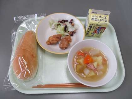 今日のミックスビーンズのマリネには、3種類の豆が入っていました。豆の標本を持参し、1年生、3年生に紹介しました。どの豆が入っていたか覚えているかな?また、聞いてみてください。今日もおいしくいただきました。